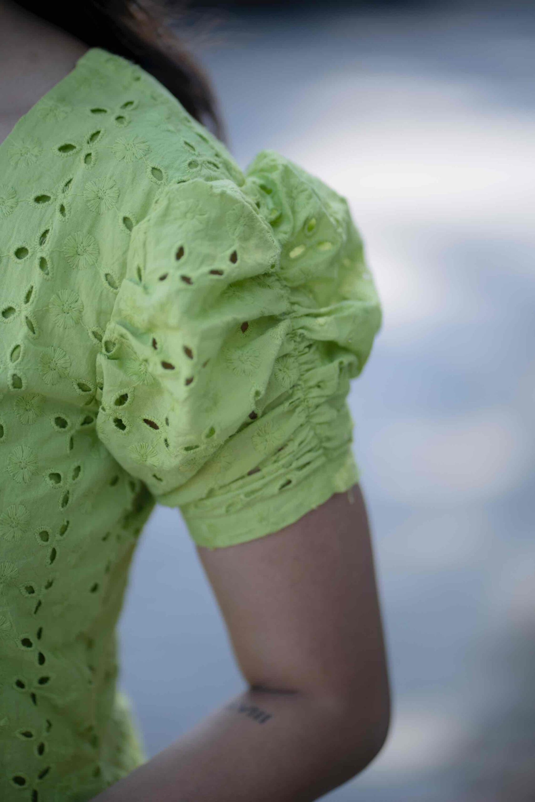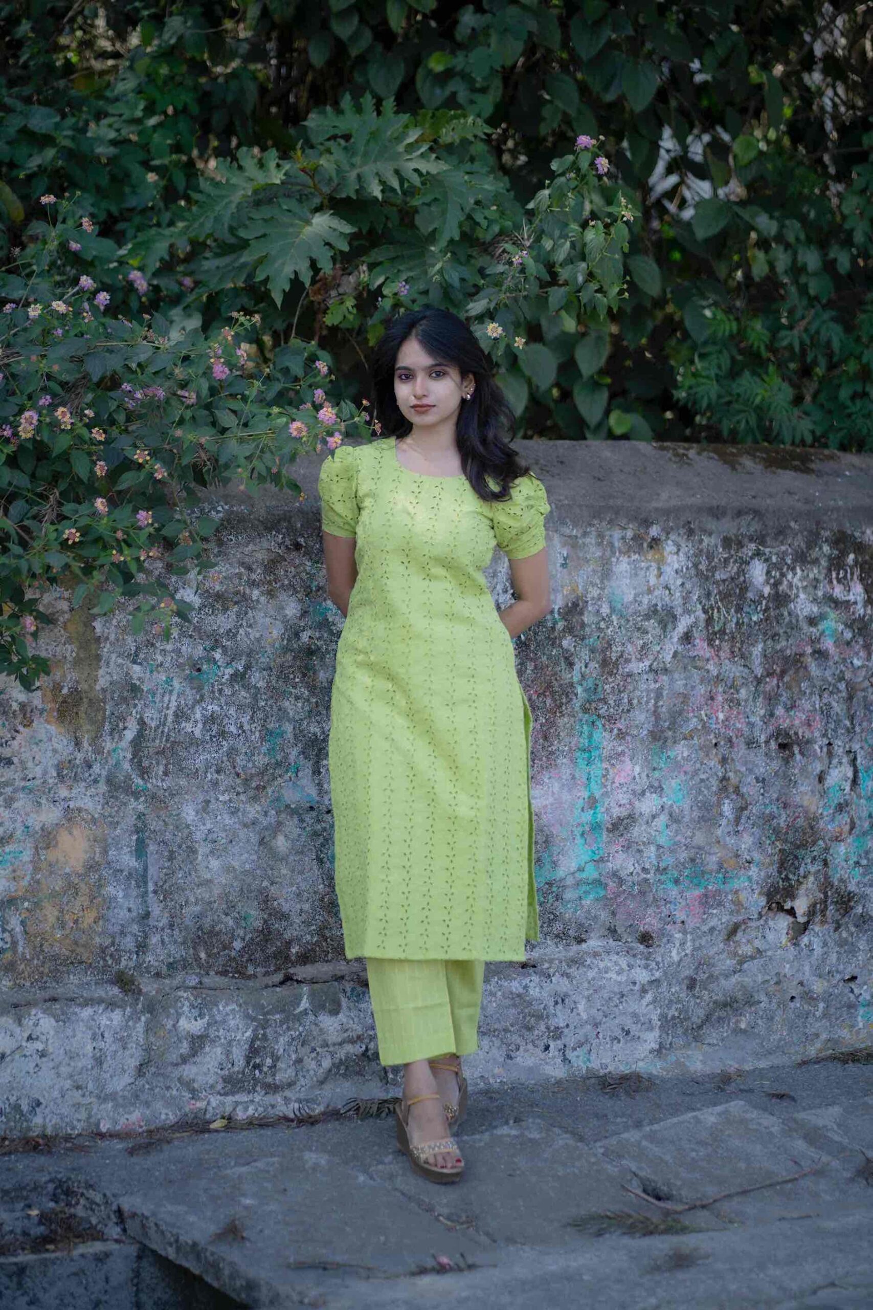 Lime green co-ord set MINT is a seamless blend of structure and grace. The top boasts delicately embroidered fabric, while the standout puff sleeves create a voluminous effect at the shoulders, adding a dramatic yet sophisticated touch. Fitted down to the elbow, the sleeves sculpt a flattering silhouette, balancing comfort with style. Paired with tailored pants for effortless movement, this ensemble is perfect for casual outings or festive gatherings.