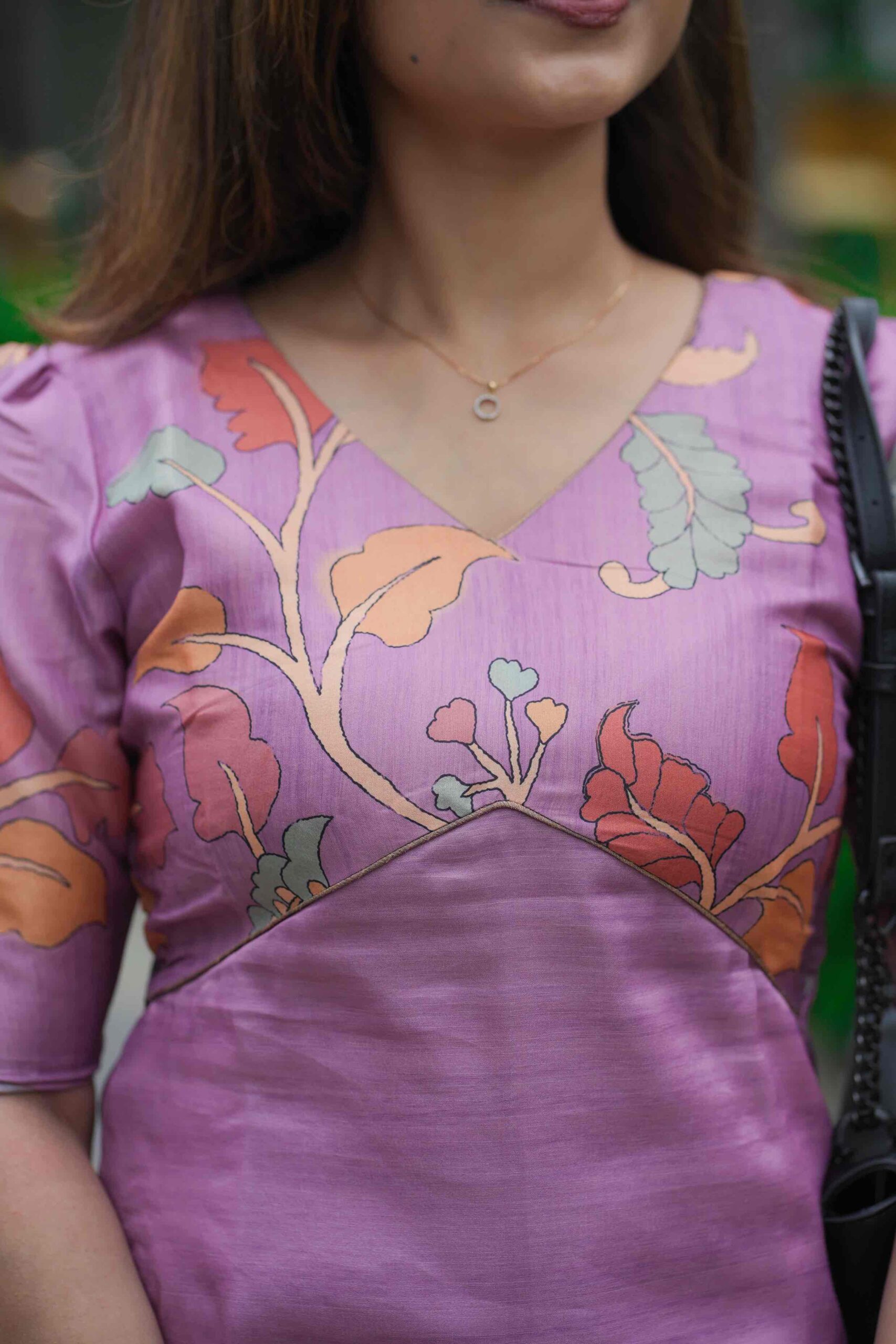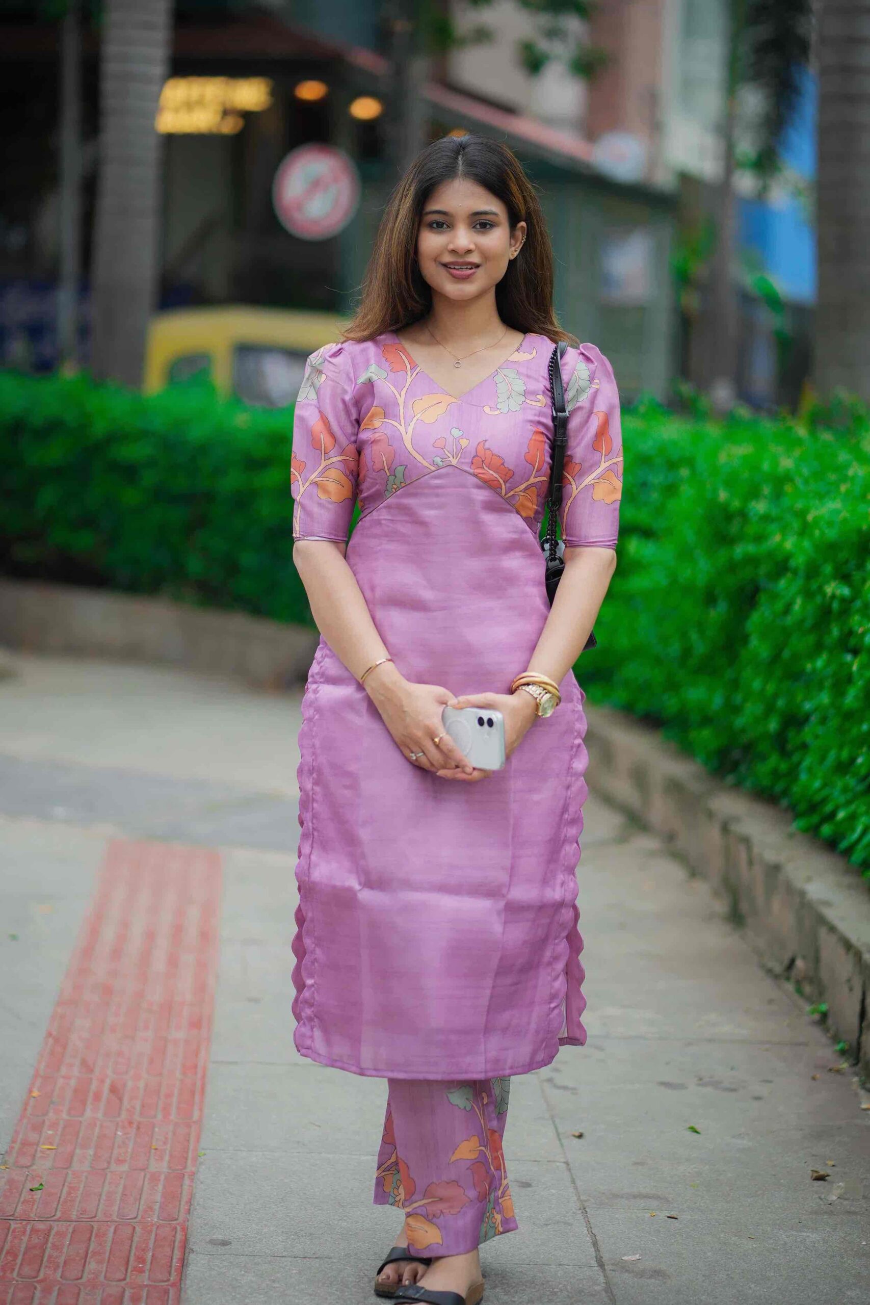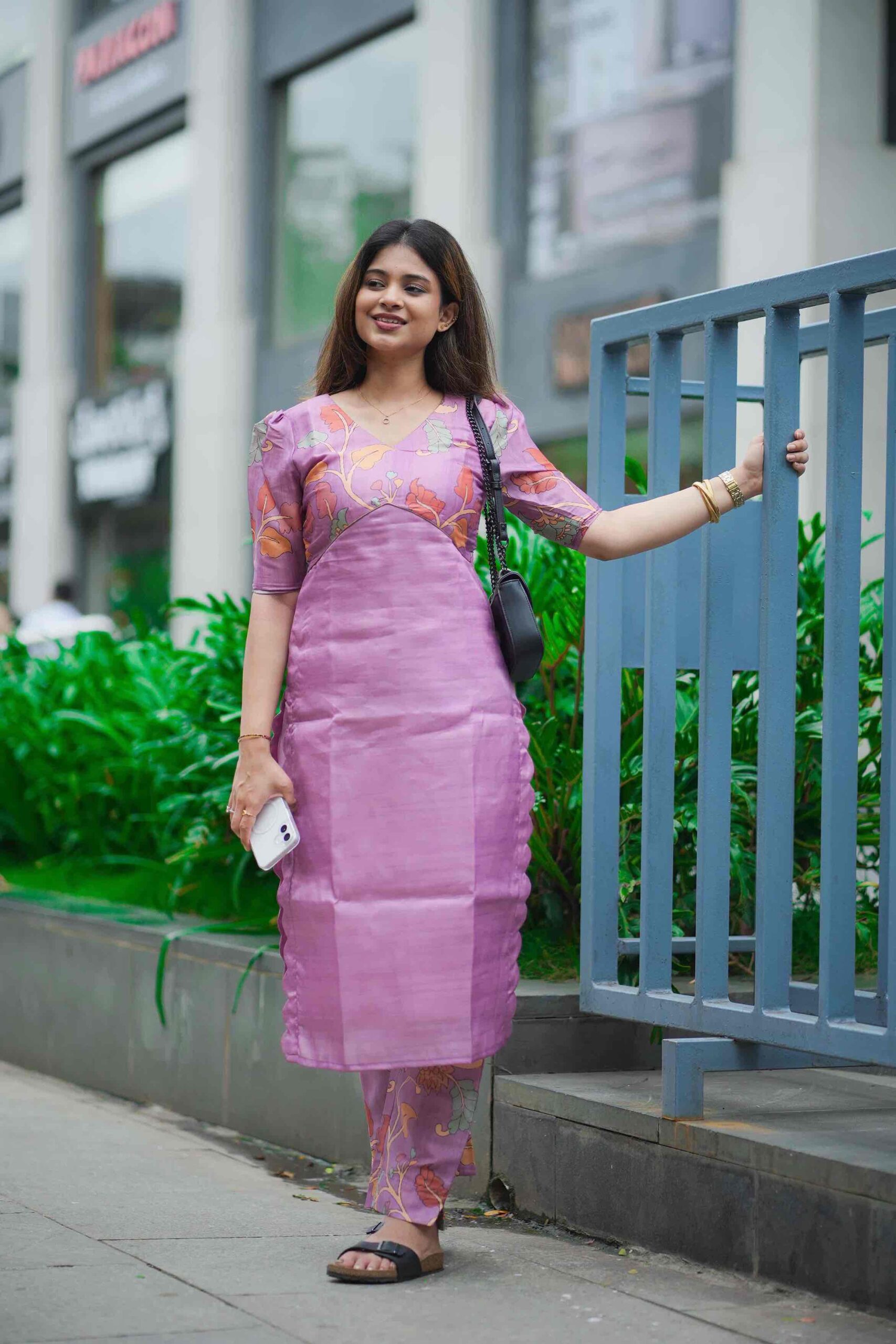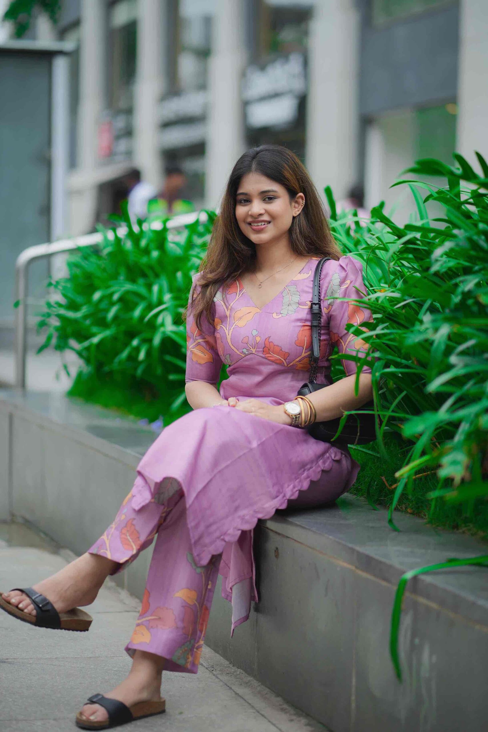 Add a touch of modern grace with the Purple Mellow Co-ord Set, designed with piping details on the neckline and sleeves for a refined look. The kurti’s scalloped slit finish brings a playful edge, while the matching printed pants balance elegance with everyday comfort. A versatile choice for festive gatherings, casual outings, or chic office wear.