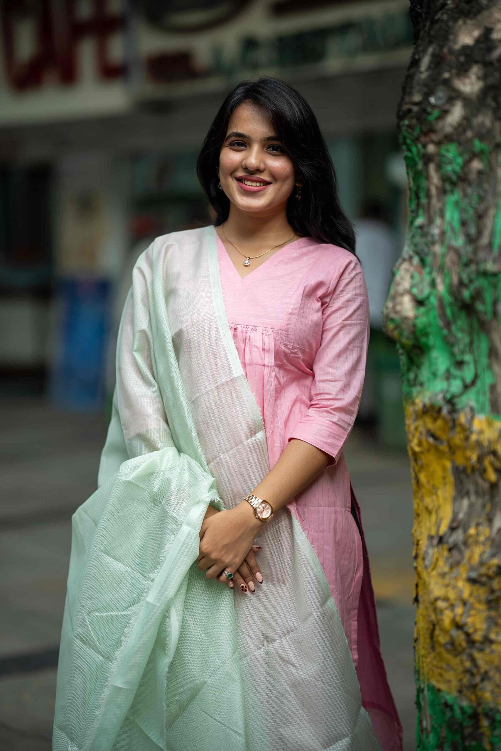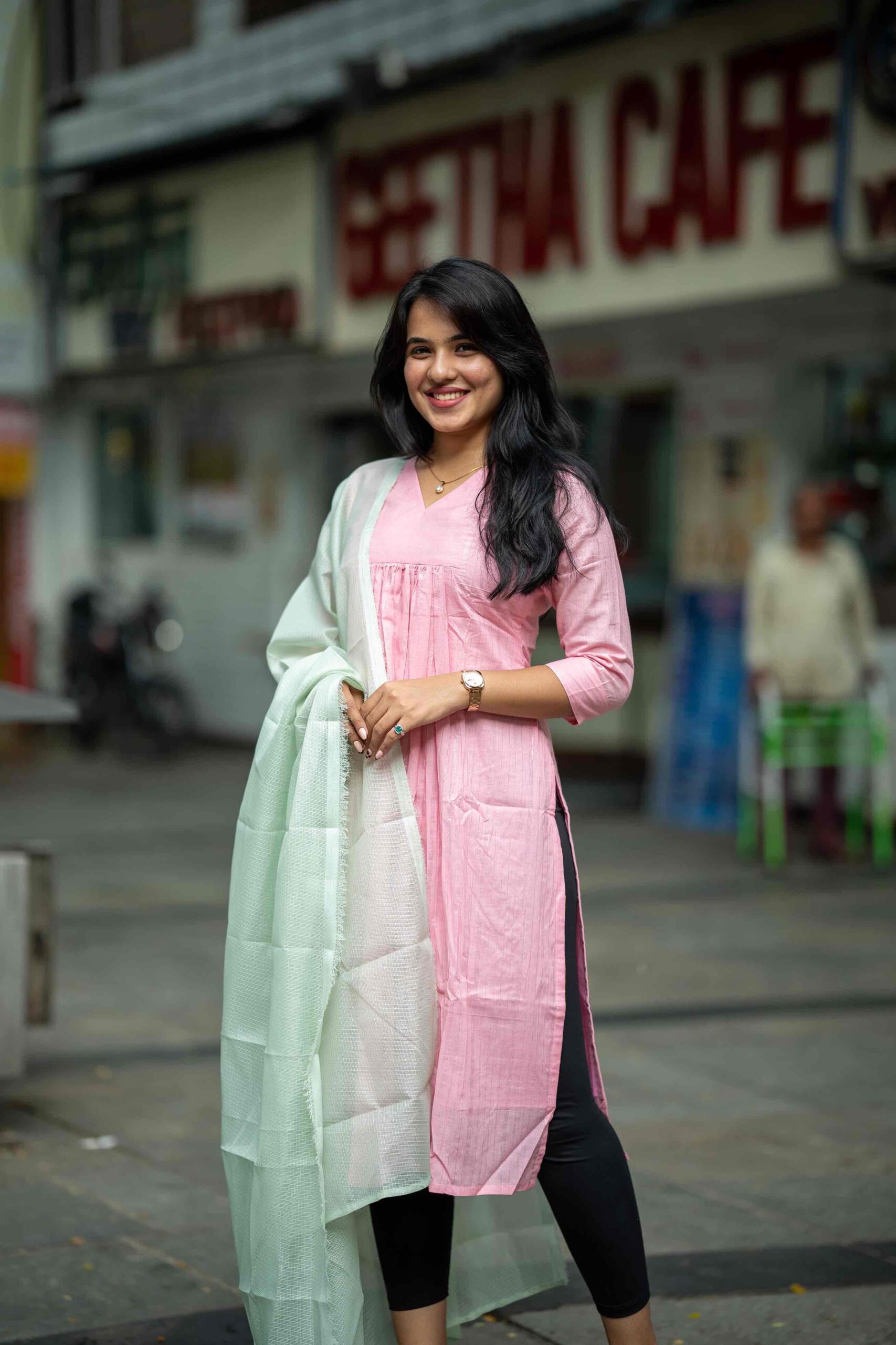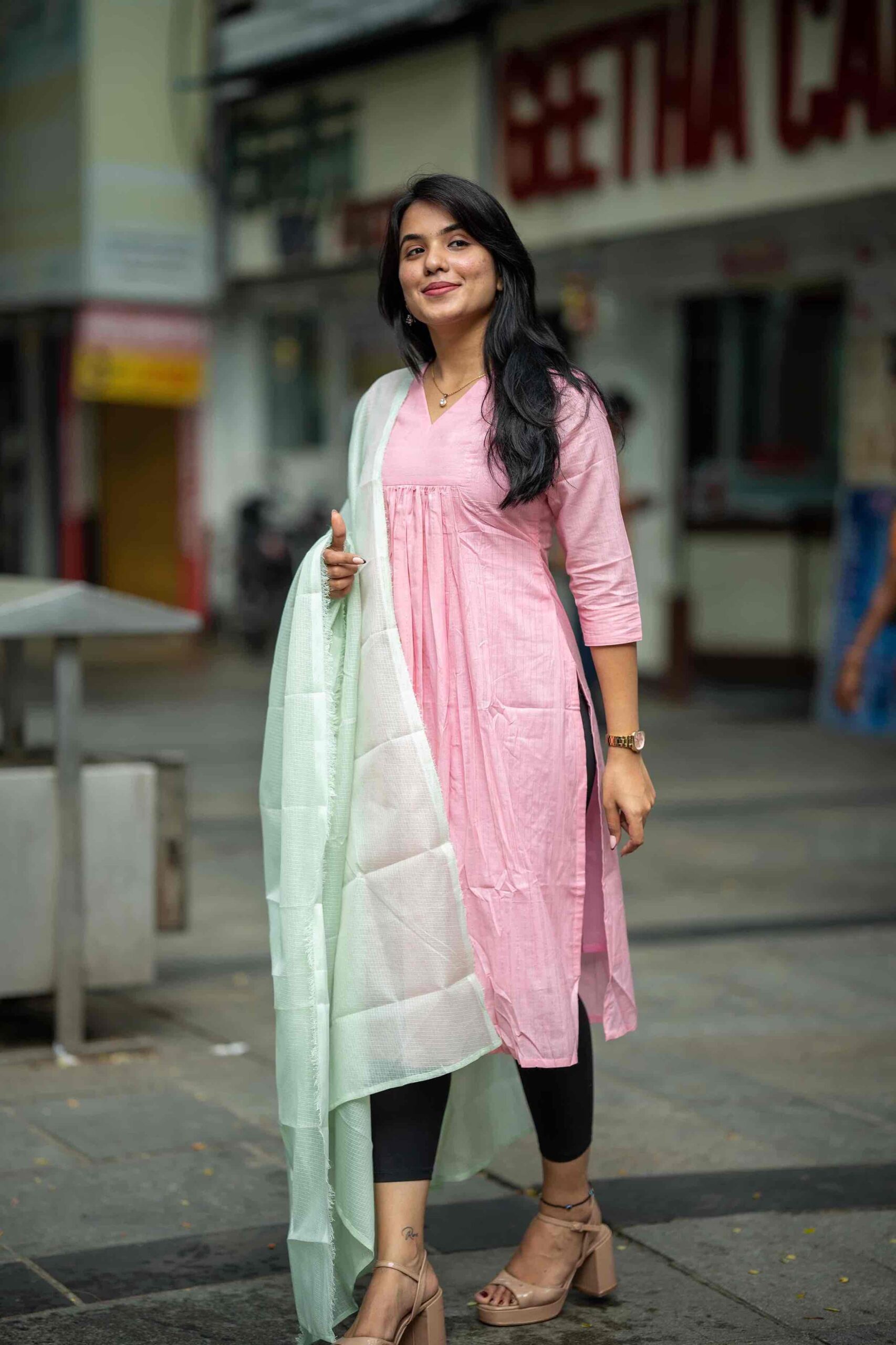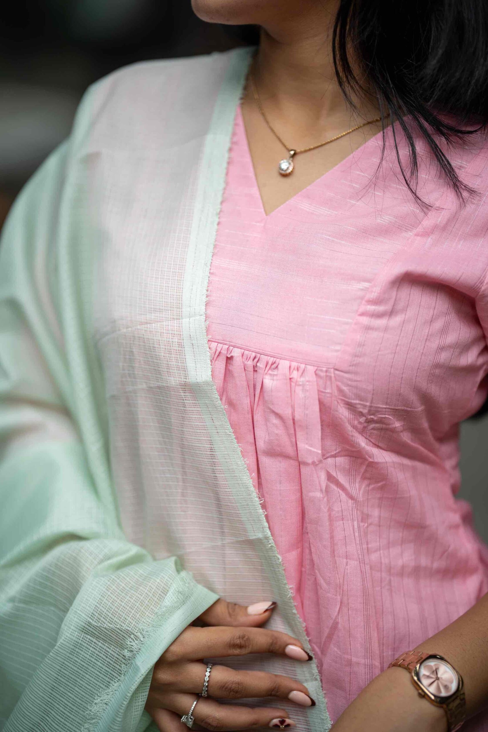 Color     –  CANDY PINK color top & PISTA GREEN duppatta, a subtle & classy color combination.